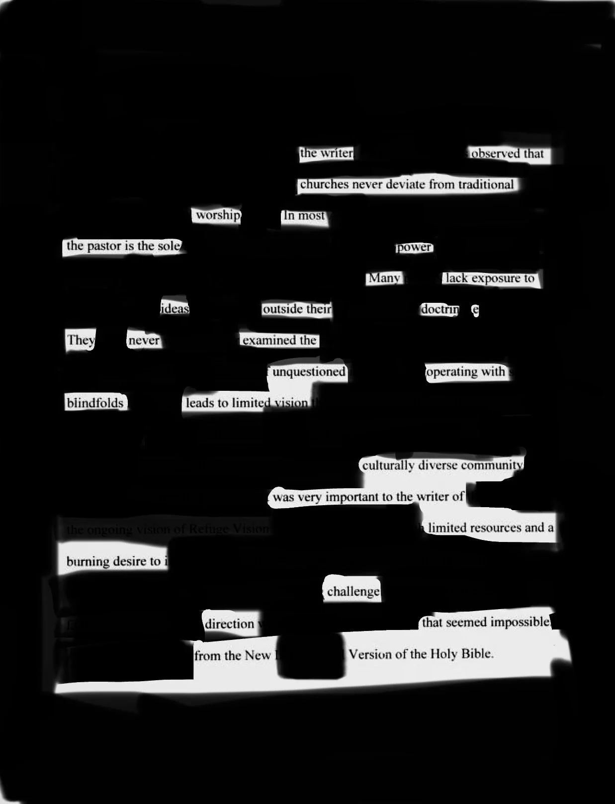 I chose to create my blackout poem from a text called, “Develop a model to transition an african american pentacostal church to a multicultural ministry” by Elijah Solomon.